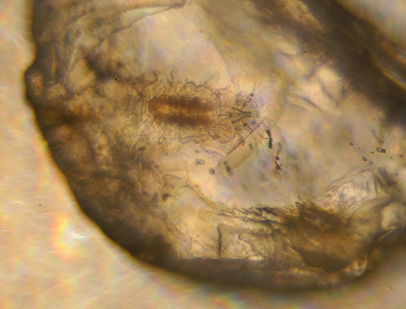 Mit etwas Glück lassen sich in den Meersandproben auch abgestreifte Cuticulae finden, bei denen seitlich ansetzende Lappen und Stacheln einfacher zu erkennen sind als beim sandkornverklebten Tier: |